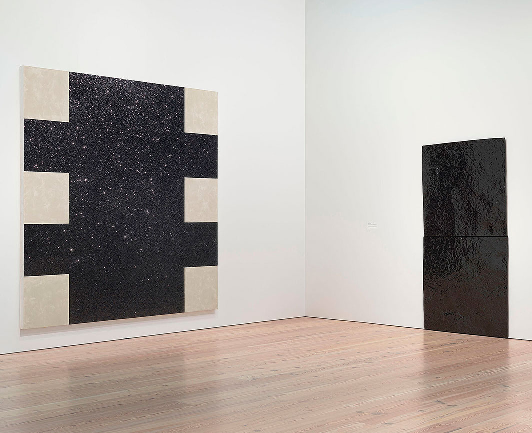 Corse was born in Berkeley, California and lived in Los Angeles after studying at UC Santa Barbara and the Chouinard Art Institute (now CalArts). She first gained attention in the mid-’60s with white, shaped-canvas monochromes and light box-like constructions made from Plexiglas and fluorescent lights. In 1968, she discovered glass microbeads, the tiny prismatic spheres often embedded in roads or street signs for nighttime reflectivity. She began to attach the beads to the painted surfaces of her canvases, satisfying her desire to create different sensory effects with light.